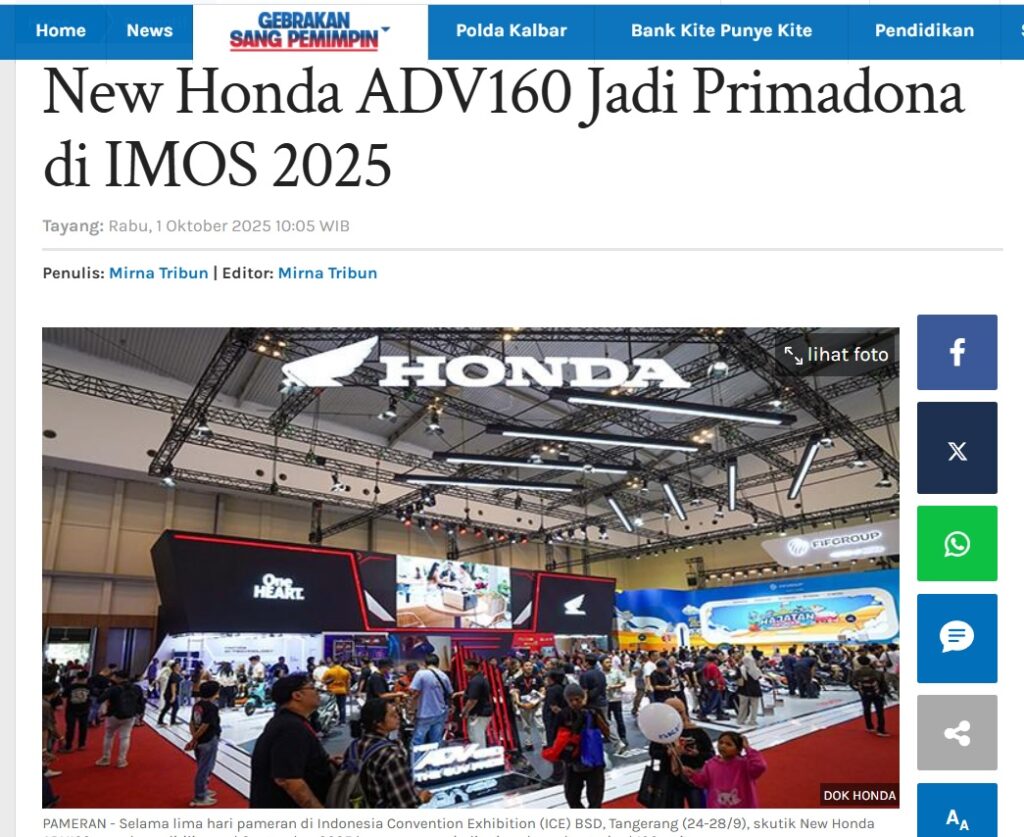 New Honda ADV160 Jadi Primadona di IMOS 2025 by Ishak Ismail 1 Oktober 2025 in Silahkan kunjungi https://pontianak.tribunnews.com/otomotif/1143763/new-honda-adv160-jadi-primadona-di-imos-2025. You Might Like Regional Public Launching New ADV160 The SUV Pride Grand Launching New PCX 160 Truly Exceptional! Tetap hati-hati ya bro sist berkendara saat hujan.
