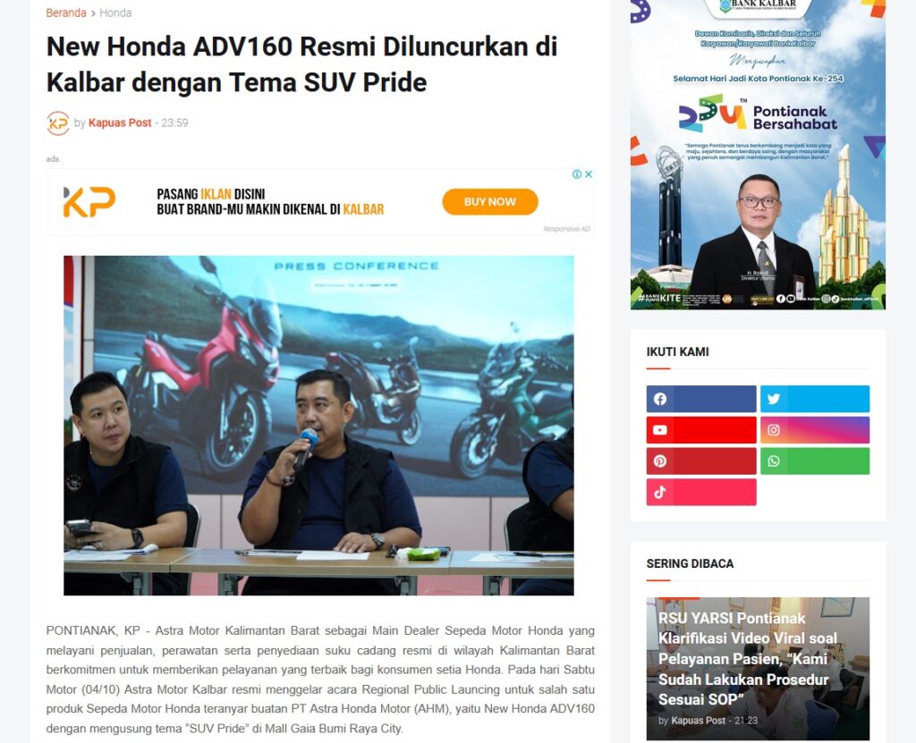 New Honda ADV160 Resmi Diluncurkan di Kalbar dengan Tema SUV Pride by Muhammad Arif 6 November 2025 in Silahkan kunjungi https://www.kapuaspost.web.id/2025/11/new-honda-adv160-resmi-diluncurkan-di.html. Tags: astra Astra Motor kalbar Astra Motor Pontianak astramotor honda kalbar pontianak sepeda motor You Might Like Regional Public Launching New ADV160 The SUV Pride Grand Launching New PCX 160 Truly Exceptional! Tetap hati-hati ya bro sist berkendara saat hujan.