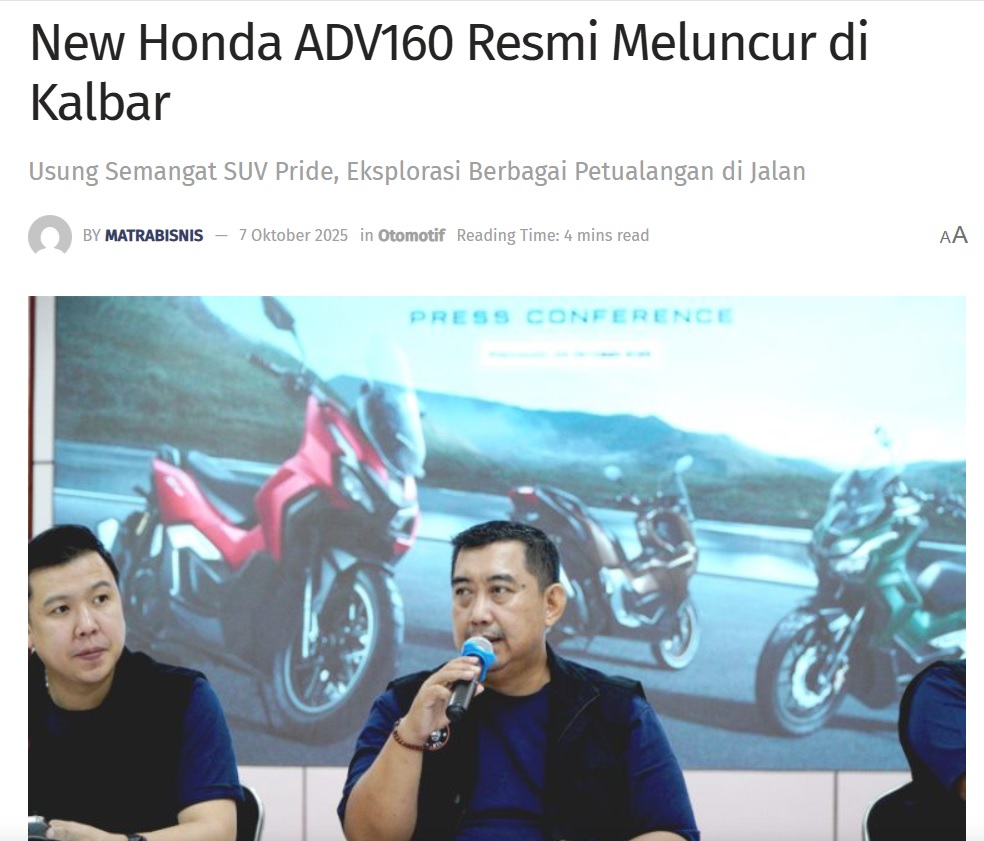 New Honda ADV160 Resmi Meluncur di Kalbar by Sri Yuliantiningsih 7 Oktober 2025 in Silahkan kunjungi https://matrabisnis.id/2025/10/07/new-honda-adv160-resmi-meluncur-di-kalbar/. You Might Like Regional Public Launching New ADV160 The SUV Pride Grand Launching New PCX 160 Truly Exceptional! Tetap hati-hati ya bro sist berkendara saat hujan.