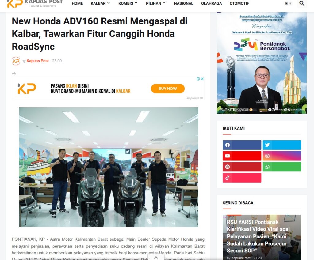 New Honda ADV160 Resmi Mengaspal di Kalbar, Tawarkan Fitur Canggih Honda RoadSync by Muhammad Arif 2 November 2025 in Silahkan kunjungi https://www.kapuaspost.web.id/2025/11/new-honda-adv160-resmi-mengaspal-di.html. Tags: astra Astra Motor kalbar Astra Motor Pontianak astramotor honda kalbar pontianak sepeda motor You Might Like Regional Public Launching New ADV160 The SUV Pride Grand Launching New PCX 160 Truly Exceptional! Tetap hati-hati ya bro sist berkendara saat hujan.