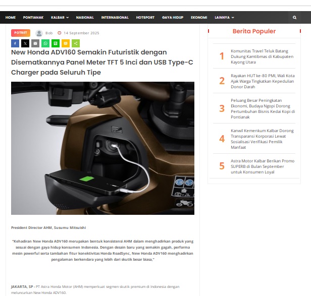 New Honda ADV160 Semakin Futuristik dengan Disematkannya Panel Meter TFT 5 Inci dan USB Type-C Charger pada Seluruh Tipe by masmul 14 September 2025 in Silahkan kunjungi https://www.suarapemredkalbar.com/read/potret/14092025/new-honda-adv160-semakin-futuristik-dengan-disematkannya-panel-meter-tft-5-inci-dan-usb-type-c-charger-pada-seluruh-tipe. You Might Like Regional Public Launching New ADV160 The SUV Pride Grand Launching New PCX 160 Truly Exceptional! Tetap hati-hati ya bro sist berkendara saat hujan.