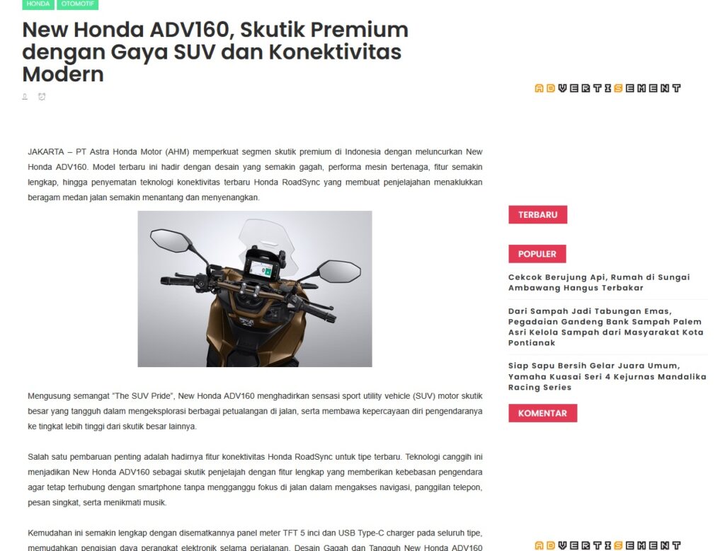 New Honda ADV160, Skutik Premium dengan Gaya SUV dan Konektivitas Modern by Muhammad Arif 22 September 2025 in Silahkan kunjungi https://www.kapuaspost.web.id/2025/09/new-honda-adv160-skutik-premium-dengan.html. Tags: astra Astra Motor kalbar Astra Motor Pontianak astramotor honda kalbar pontianak sepeda motor You Might Like Regional Public Launching New ADV160 The SUV Pride Grand Launching New PCX 160 Truly Exceptional! Tetap hati-hati ya bro sist berkendara saat hujan.