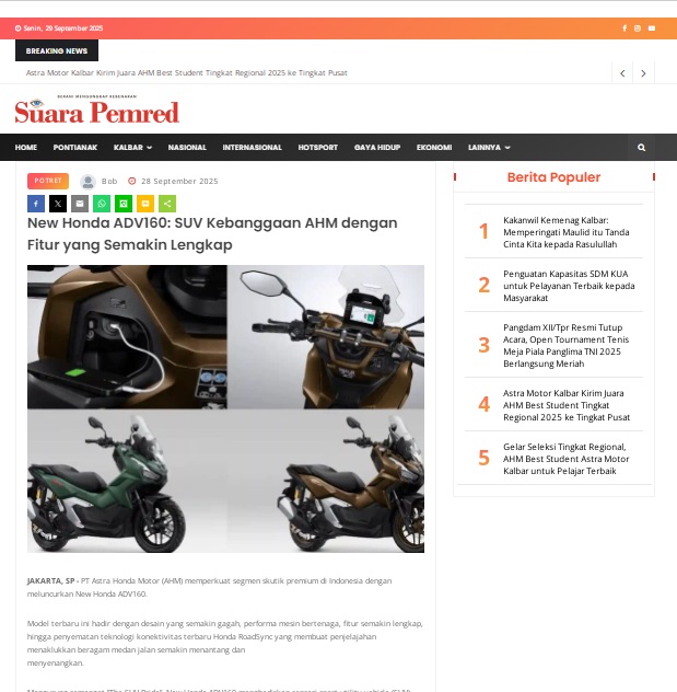 New Honda ADV160: SUV Kebanggaan AHM dengan Fitur yang Semakin Lengkap by masmul 28 September 2025 in Silahkan kunjungi https://www.suarapemredkalbar.com/read/potret/28092025/new-honda-adv160-suv-kebanggaan-ahm-dengan-fitur-yang-semakin-lengkap. You Might Like Regional Public Launching New ADV160 The SUV Pride Grand Launching New PCX 160 Truly Exceptional! Tetap hati-hati ya bro sist berkendara saat hujan.
