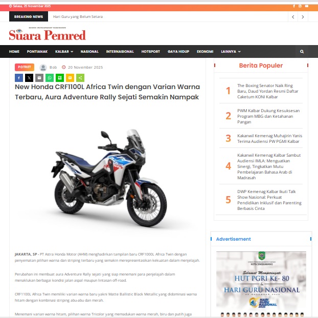 New Honda CRF1100L Africa Twin dengan Varian Warna Terbaru, Aura Adventure Rally Sejati Semakin Nampak by masmul 20 November 2025 in Silahkan kunjungi https://www.suarapemredkalbar.com/read/potret/20112025/new-honda-crf1100l-africa-twin-dengan-varian-warna-terbaru-aura-adventure-rally-sejati-semakin-nampak. You Might Like Regional Public Launching New ADV160 The SUV Pride Grand Launching New PCX 160 Truly Exceptional! Tetap hati-hati ya bro sist berkendara saat hujan.