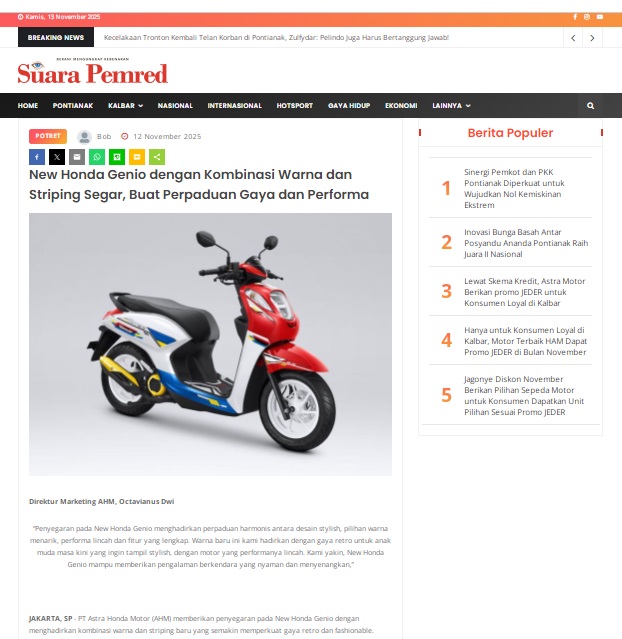 New Honda Genio dengan Kombinasi Warna dan Striping Segar, Buat Perpaduan Gaya dan Performa by masmul 12 November 2025 in Silahkan kunjungi https://www.suarapemredkalbar.com/read/potret/12112025/new-honda-genio-dengan-kombinasi-warna-dan-striping-segar-buat-perpaduan-gaya-dan-performa. You Might Like Regional Public Launching New ADV160 The SUV Pride Grand Launching New PCX 160 Truly Exceptional! Tetap hati-hati ya bro sist berkendara saat hujan.
