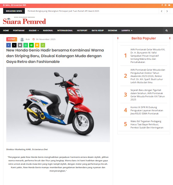 New Honda Genio Hadir bersama Kombinasi Warna dan Striping Baru, Disukai Kalangan Muda dengan Gaya Retro dan Fashionable by masmul 6 November 2025 in Silahkan kunjungi https://www.suarapemredkalbar.com/read/potret/06112025/new-honda-genio-hadir-bersama-kombinasi-warna-dan-striping-baru-disukai-kalangan-muda-dengan-gaya-retro-dan-fashionable. You Might Like Regional Public Launching New ADV160 The SUV Pride Grand Launching New PCX 160 Truly Exceptional! Tetap hati-hati ya bro sist berkendara saat hujan.