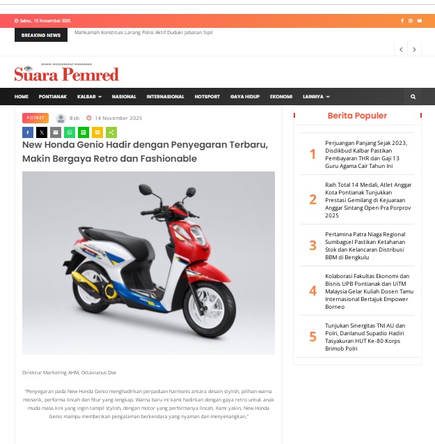 New Honda Genio Hadir dengan Penyegaran Terbaru, Makin Bergaya Retro dan Fashionable by masmul 14 November 2025 in Silahkan kunjungi https://www.suarapemredkalbar.com/read/potret/14112025/new-honda-genio-hadir-dengan-penyegaran-terbaru-makin-bergaya-retro-dan-fashionable. You Might Like Regional Public Launching New ADV160 The SUV Pride Grand Launching New PCX 160 Truly Exceptional! Tetap hati-hati ya bro sist berkendara saat hujan.