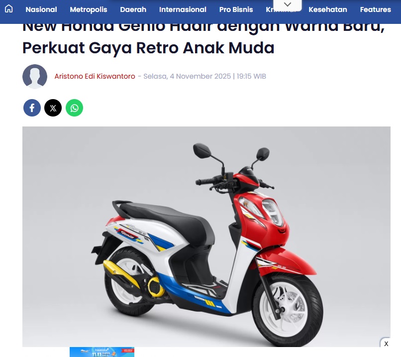 New Honda Genio Hadir dengan Warna Baru, Perkuat Gaya Retro Anak Muda by Aristono Edi Kiswantoro 4 November 2025 in Silahkan kunjungi https://pontianakpost.jawapos.com/pro-bisnis/1466789238/new-honda-genio-hadir-dengan-warna-baru-perkuat-gaya-retro-anak-muda. You Might Like Regional Public Launching New ADV160 The SUV Pride Grand Launching New PCX 160 Truly Exceptional! Tetap hati-hati ya bro sist berkendara saat hujan.
