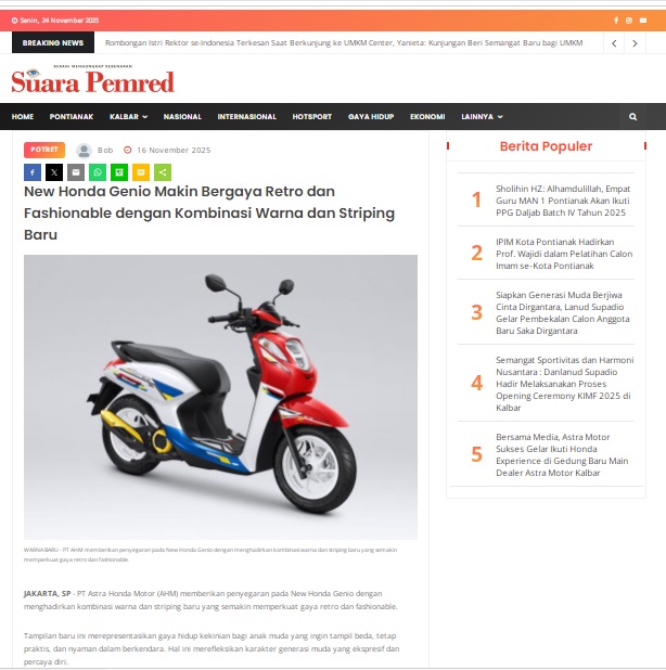 New Honda Genio Makin Bergaya Retro dan Fashionable dengan Kombinasi Warna dan Striping Baru by masmul 16 November 2025 in Silahkan kunjungi https://www.suarapemredkalbar.com/read/potret/16112025/new-honda-genio-makin-bergaya-retro-dan-fashionable-dengan-kombinasi-warna-dan-striping-baru. You Might Like Regional Public Launching New ADV160 The SUV Pride Grand Launching New PCX 160 Truly Exceptional! Tetap hati-hati ya bro sist berkendara saat hujan.