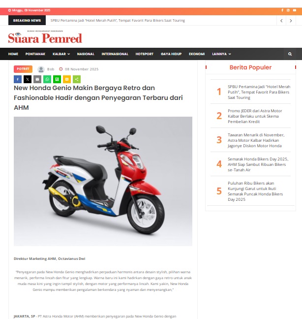 New Honda Genio Makin Bergaya Retro dan Fashionable Hadir dengan Penyegaran Terbaru dari AHM by masmul 8 November 2025 in Silahkan kunjungi https://www.suarapemredkalbar.com/read/potret/08112025/new-honda-genio-makin-bergaya-retro-dan-fashionable-hadir-dengan-penyegaran-terbarudari-ahm. You Might Like Regional Public Launching New ADV160 The SUV Pride Grand Launching New PCX 160 Truly Exceptional! Tetap hati-hati ya bro sist berkendara saat hujan.