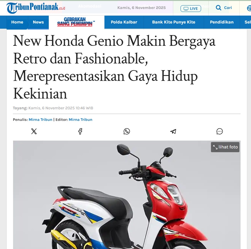 New Honda Genio Makin Bergaya Retro dan Fashionable, Merepresentasikan Gaya Hidup Kekinian by Ishak Ismail 6 November 2025 in Silahkan kunjungi https://pontianak.tribunnews.com/otomotif/1148875/new-honda-genio-makin-bergaya-retro-dan-fashionable-merepresentasikan-gaya-hidup-kekinian. You Might Like Regional Public Launching New ADV160 The SUV Pride Grand Launching New PCX 160 Truly Exceptional! Tetap hati-hati ya bro sist berkendara saat hujan.
