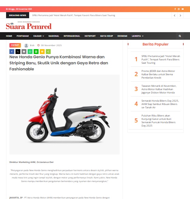 New Honda Genio Punya Kombinasi Warna dan Striping Baru, Skutik Unik dengan Gaya Retro dan Fashionable by masmul 8 November 2025 in Silahkan kunjungi https://www.suarapemredkalbar.com/read/potret/08112025/new-honda-genio-punya-kombinasi-warna-dan-striping-baru-skutik-unik-dengan-gaya-retro-dan-fashionable. You Might Like Regional Public Launching New ADV160 The SUV Pride Grand Launching New PCX 160 Truly Exceptional! Tetap hati-hati ya bro sist berkendara saat hujan.
