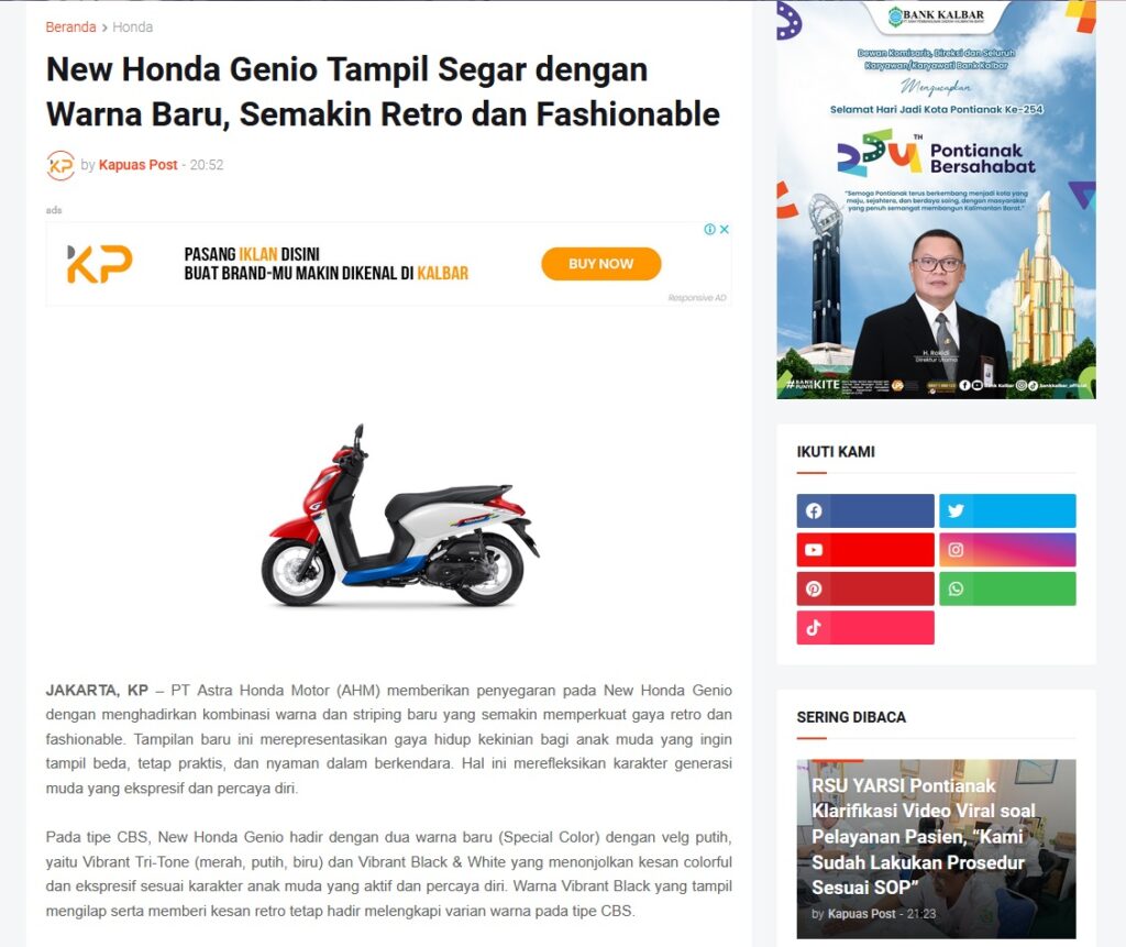 New Honda Genio Tampil Segar dengan Warna Baru, Semakin Retro dan Fashionable by Muhammad Arif 13 November 2025 in Silahkan kunjungi https://www.kapuaspost.web.id/2025/11/new-honda-genio-tampil-segar-dengan_19.html. Tags: astra Astra Motor kalbar Astra Motor Pontianak astramotor honda kalbar pontianak sepeda motor You Might Like Regional Public Launching New ADV160 The SUV Pride Grand Launching New PCX 160 Truly Exceptional! Tetap hati-hati ya bro sist berkendara saat hujan.