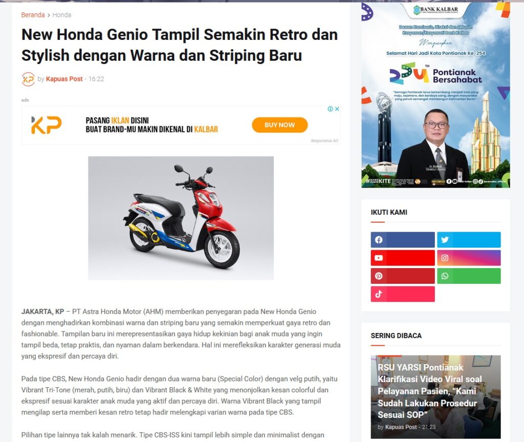 New Honda Genio Tampil Semakin Retro dan Stylish dengan Warna dan Striping Baru by Muhammad Arif 4 November 2025 in Silahkan kunjungi https://www.kapuaspost.web.id/2025/11/new-honda-genio-tampil-semakin-retro.html. Tags: astra Astra Motor kalbar Astra Motor Pontianak astramotor honda kalbar pontianak sepeda motor You Might Like Regional Public Launching New ADV160 The SUV Pride Grand Launching New PCX 160 Truly Exceptional! Tetap hati-hati ya bro sist berkendara saat hujan.