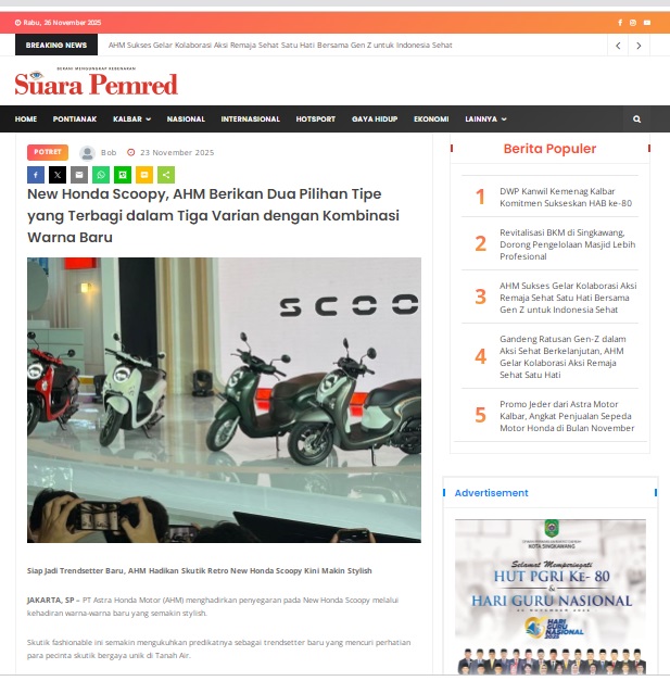 New Honda Scoopy, AHM Berikan Dua Pilihan Tipe yang Terbagi dalam Tiga Varian dengan Kombinasi Warna Baru by masmul 23 November 2025 in Silahkan kunjungi https://www.suarapemredkalbar.com/read/potret/23112025/new-honda-scoopy-ahm-berikan-dua-pilihan-tipe-yang-terbagi-dalam-tiga-varian-dengan-kombinasi-warna-baru. You Might Like Regional Public Launching New ADV160 The SUV Pride Grand Launching New PCX 160 Truly Exceptional! Tetap hati-hati ya bro sist berkendara saat hujan.