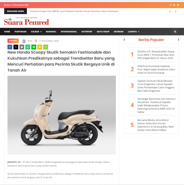 New Honda Scoopy Skutik Semakin Fashionable dan Kukuhkan Predikatnya sebagai Trendsetter Baru yang Mencuri Perhatian para Pecinta Skutik Bergaya Unik di Tanah Air by masmul 17 November 2025 in Silahkan kunjungi https://www.suarapemredkalbar.com/read/potret/17112025/new-honda-scoopy-skutik-semakin-fashionable-dan-kukuhkan-predikatnya-sebagai-trendsetter-baru-yang-mencuri-perhatian-para-pecinta-skutik-bergaya-unik-di-tanah-air. You Might Like Regional Public Launching New ADV160 The SUV Pride Grand Launching New PCX 160 Truly Exceptional! Tetap hati-hati ya bro sist berkendara saat hujan.