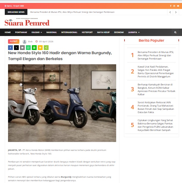 New Honda Stylo 160 Hadir dengan Warna Burgundy, Tampil Elegan dan Berkelas by masmul 9 April 2026 in Silahkan kunjungi https://www.suarapemredkalbar.com/read/potret/09042026/new-honda-stylo-160-hadir-dengan-warna-burgundy-tampil-elegan-dan-berkelas. You Might Like Regional Public Launching New ADV160 The SUV Pride Grand Launching New PCX 160 Truly Exceptional! Tetap hati-hati ya bro sist berkendara saat hujan.