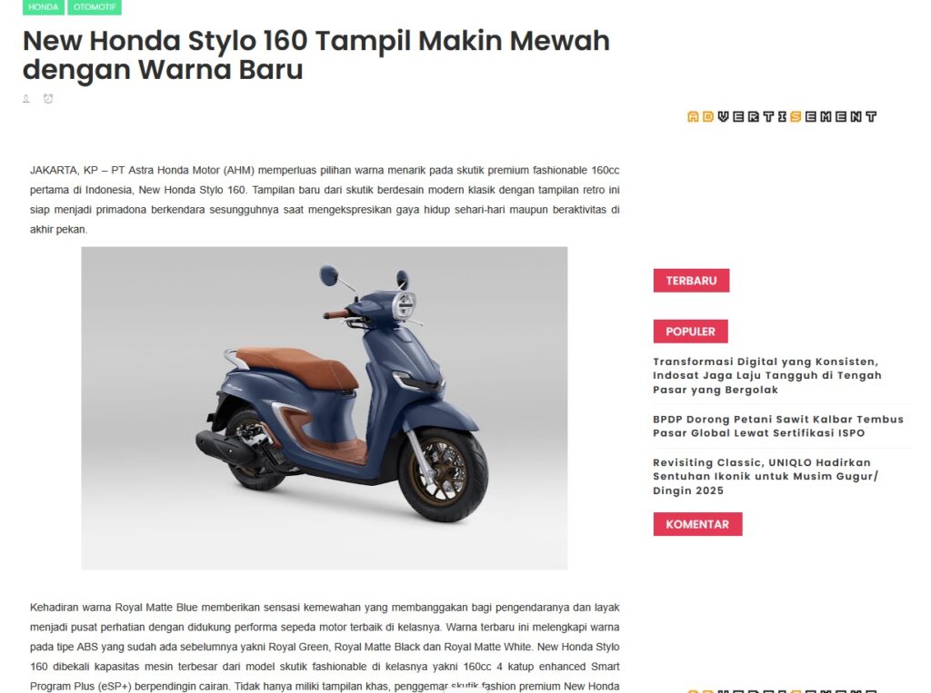 New Honda Stylo 160 Tampil Makin Mewah dengan Warna Baru by Muhammad Arif 21 Agustus 2025 in Silahkan kunjungi https://www.kapuaspost.web.id/2025/08/new-honda-stylo-160-tampil-makin-mewah.html. Tags: astra Astra Motor kalbar Astra Motor Pontianak astramotor honda kalbar pontianak sepeda motor You Might Like Regional Public Launching New ADV160 The SUV Pride Grand Launching New PCX 160 Truly Exceptional! Tetap hati-hati ya bro sist berkendara saat hujan.