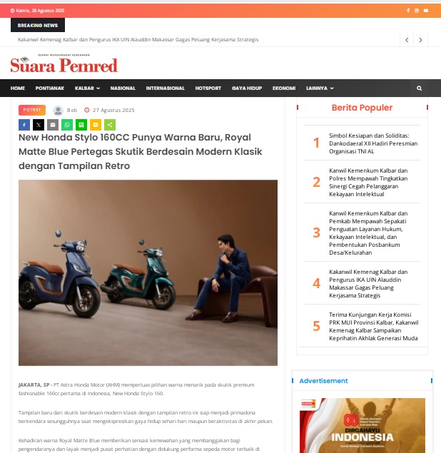 New Honda Stylo 160CC Punya Warna Baru, Royal Matte Blue Pertegas Skutik Berdesain Modern Klasik dengan Tampilan Retro by masmul 27 Agustus 2025 in Silahkan kunjungi https://www.suarapemredkalbar.com/read/potret/27082025/new-honda-stylo-160cc-punya-warna-baru-royal-matte-blue-pertegas-skutik-berdesain-modern-klasik-dengan-tampilan-retro. You Might Like Regional Public Launching New ADV160 The SUV Pride Grand Launching New PCX 160 Truly Exceptional! Tetap hati-hati ya bro sist berkendara saat hujan.