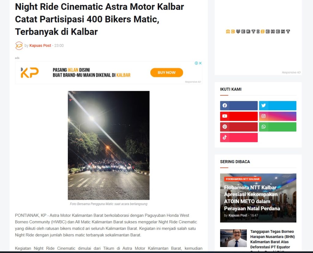 Night Ride Cinematic Astra Motor Kalbar Catat Partisipasi 400 Bikers Matic, Terbanyak di Kalbar by Muhammad Arif 7 Februari 2026 in Silahkan kunjungi https://www.kapuaspost.web.id/2026/02/night-ride-cinematic-astra-motor-kalbar.html. Tags: astra Astra Motor kalbar Astra Motor Pontianak astramotor honda kalbar pontianak sepeda motor You Might Like Regional Public Launching New ADV160 The SUV Pride Grand Launching New PCX 160 Truly Exceptional! Tetap hati-hati ya bro sist berkendara saat hujan.