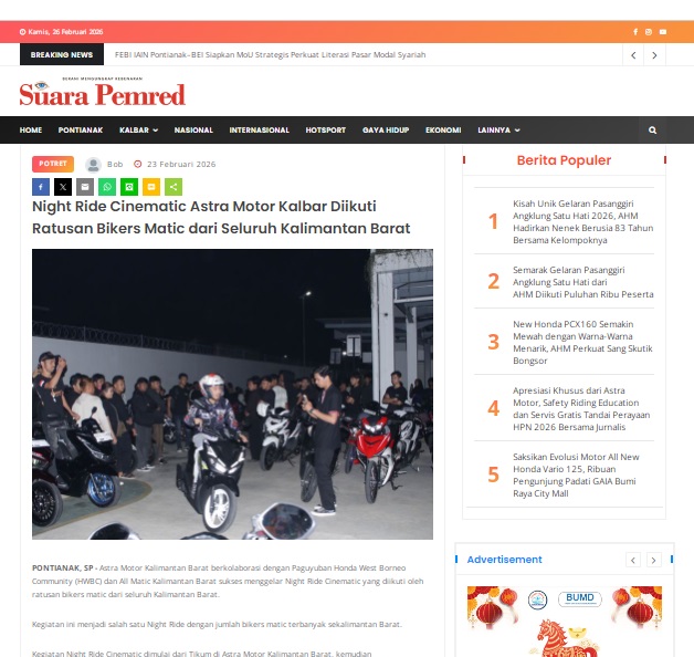 Night Ride Cinematic Astra Motor Kalbar Diikuti Ratusan Bikers Matic dari Seluruh Kalimantan Barat by masmul 23 Februari 2026 in Silahkan kunjungi https://www.suarapemredkalbar.com/read/potret/23022026/night-ride-cinematic-astra-motor-kalbar-diikuti-ratusan-bikers-matic-dari-seluruh-kalimantan-barat-1. You Might Like Regional Public Launching New ADV160 The SUV Pride Grand Launching New PCX 160 Truly Exceptional! Tetap hati-hati ya bro sist berkendara saat hujan.