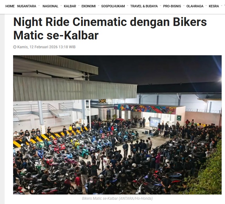 Night Ride Cinematic dengan Bikers Matic se-Kalbar by Dedi 12 Februari 2026 in Silahkan kunjungi https://kalbar.antaranews.com/berita/688554/night-ride-cinematic-dengan-bikers-matic-se-kalbar. You Might Like Regional Public Launching New ADV160 The SUV Pride Grand Launching New PCX 160 Truly Exceptional! Tetap hati-hati ya bro sist berkendara saat hujan.