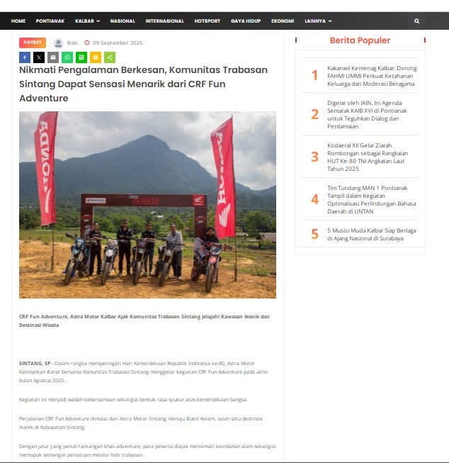 Nikmati Pengalaman Berkesan, Komunitas Trabasan Sintang Dapat Sensasi Menarik dari CRF Fun Adventure by masmul 9 September 2025 in Silahkan kunjungi https://www.suarapemredkalbar.com/read/potret/09092025/nikmati-pengalaman-berkesan-komunitas-trabasan-sintang-dapat-sensasi-menarik-dari-crf-fun-adventure. You Might Like Regional Public Launching New ADV160 The SUV Pride Grand Launching New PCX 160 Truly Exceptional! Tetap hati-hati ya bro sist berkendara saat hujan.