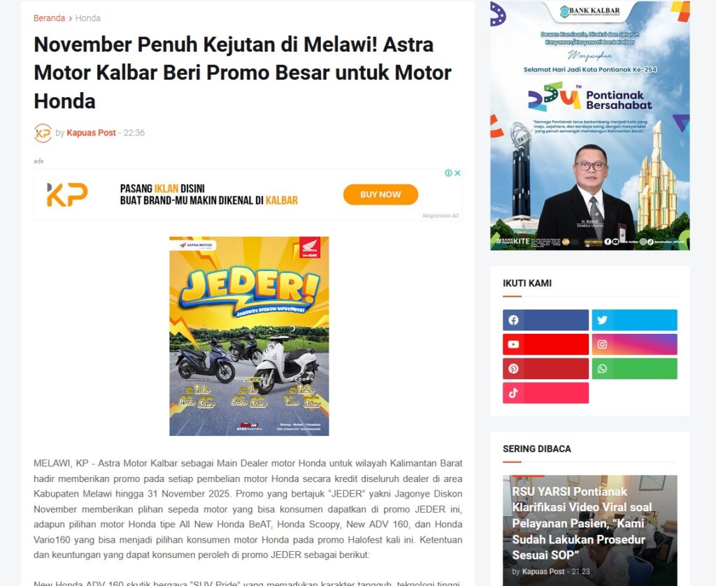 November Penuh Kejutan di Melawi! Astra Motor Kalbar Beri Promo Besar untuk Motor Honda by Muhammad Arif 9 November 2025 in Silahkan kunjungi https://www.kapuaspost.web.id/2025/11/november-penuh-kejutan-di-melawi-astra.html. Tags: astra Astra Motor kalbar Astra Motor Pontianak astramotor honda kalbar pontianak sepeda motor You Might Like Regional Public Launching New ADV160 The SUV Pride Grand Launching New PCX 160 Truly Exceptional! Tetap hati-hati ya bro sist berkendara saat hujan.