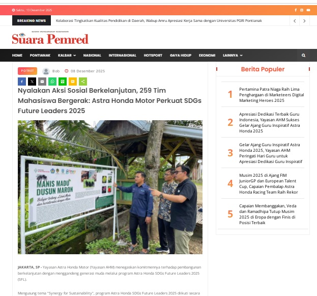 Nyalakan Aksi Sosial Berkelanjutan, 259 Tim Mahasiswa Bergerak: Astra Honda Motor Perkuat SDGs Future Leaders 2025 by masmul 8 Desember 2025 in Silahkan kunjungi https://www.suarapemredkalbar.com/read/potret/08122025/nyalakan-aksi-sosial-berkelanjutan-259-tim-mahasiswa-bergerak-astra-honda-motor-perkuat-sdgs-future-leaders-2025. You Might Like Regional Public Launching New ADV160 The SUV Pride Grand Launching New PCX 160 Truly Exceptional! Tetap hati-hati ya bro sist berkendara saat hujan.