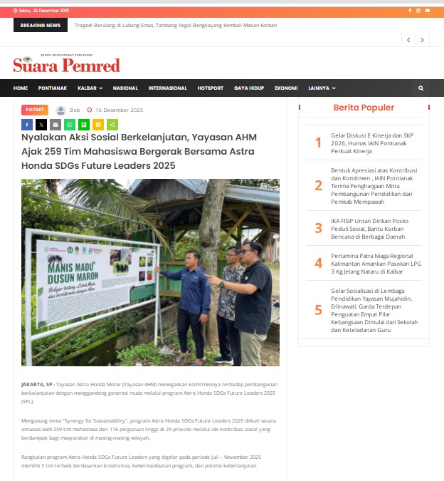 Nyalakan Aksi Sosial Berkelanjutan, Yayasan AHM Ajak 259 Tim Mahasiswa Bergerak Bersama Astra Honda SDGs Future Leaders 2025 by masmul 16 Desember 2025 in Silahkan kunjungi https://www.suarapemredkalbar.com/read/potret/16122025/nyalakan-aksi-sosial-berkelanjutan-yayasan-ahm-ajak-259-tim-mahasiswa-bergerak-bersama-astra-honda-sdgs-future-leaders-2025. You Might Like Regional Public Launching New ADV160 The SUV Pride Grand Launching New PCX 160 Truly Exceptional! Tetap hati-hati ya bro sist berkendara saat hujan.