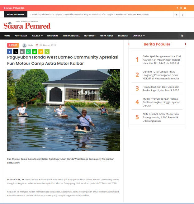 Paguyuban Honda West Borneo Community Apresiasi Fun Motour Camp Astra Motor Kalbar by masmul 22 Maret 2026 in Silahkan kunjungi https://www.suarapemredkalbar.com/read/potret/22032026/paguyuban-honda-west-borneo-community-apresiasi-fun-motour-camp-astra-motor-kalbar. You Might Like Regional Public Launching New ADV160 The SUV Pride Grand Launching New PCX 160 Truly Exceptional! Tetap hati-hati ya bro sist berkendara saat hujan.