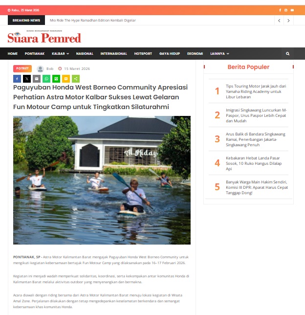 Paguyuban Honda West Borneo Community Apresiasi Perhatian Astra Motor Kalbar Sukses Lewat Gelaran Fun Motour Camp untuk Tingkatkan Silaturahmi by masmul 15 Maret 2026 in Silahkan kunjungi https://www.suarapemredkalbar.com/read/potret/15032026/paguyuban-honda-west-borneo-community-apresiasi-perhatian-astra-motor-kalbar-sukses-lewat-gelaran-fun-motour-camp-untuk-tingkatkan-silaturahmi. You Might Like Regional Public Launching New ADV160 The SUV Pride Grand Launching New PCX 160 Truly Exceptional! Tetap hati-hati ya bro sist berkendara saat hujan.