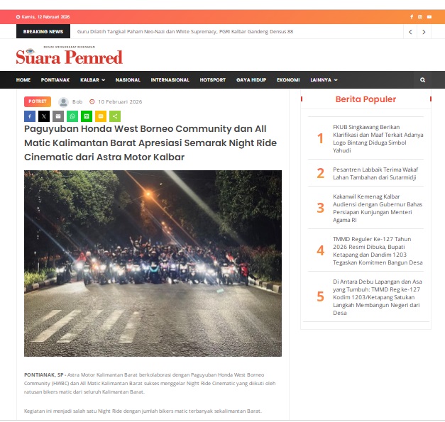 Paguyuban Honda West Borneo Community dan All Matic Kalimantan Barat Apresiasi Semarak Night Ride Cinematic dari Astra Motor Kalbar by masmul 10 Februari 2026 in Silahkan kunjungi https://www.suarapemredkalbar.com/read/potret/10022026/paguyuban-honda-west-borneo-community-dan-all-matic-kalimantan-barat-apresiasi-semarak-night-ride-cinematic-dari-astra-motor-kalbar. You Might Like Regional Public Launching New ADV160 The SUV Pride Grand Launching New PCX 160 Truly Exceptional! Tetap hati-hati ya bro sist berkendara saat hujan.