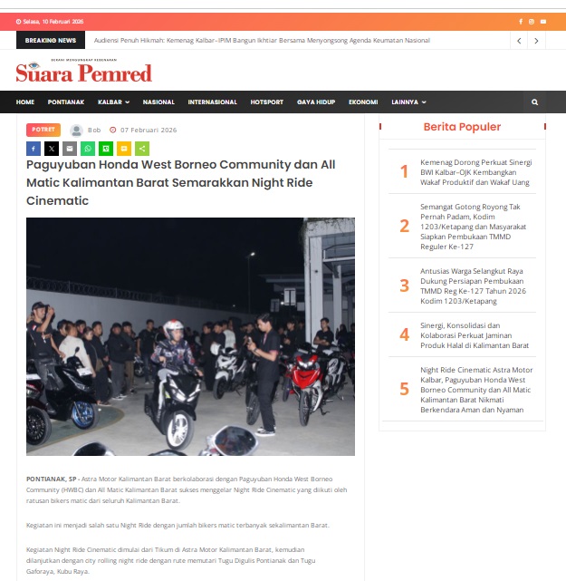Paguyuban Honda West Borneo Community dan All Matic Kalimantan Barat Semarakkan Night Ride Cinematic by masmul 7 Februari 2026 in Silahkan kunjungi https://www.suarapemredkalbar.com/read/potret/07022026/paguyuban-honda-west-borneo-community-dan-all-matic-kalimantan-barat-semarakkan-night-ride-cinematic. You Might Like Regional Public Launching New ADV160 The SUV Pride Grand Launching New PCX 160 Truly Exceptional! Tetap hati-hati ya bro sist berkendara saat hujan.