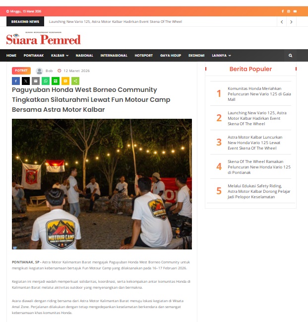 Paguyuban Honda West Borneo Community Tingkatkan Silaturahmi Lewat Fun Motour Camp Bersama Astra Motor Kalbar by masmul 12 Maret 2026 in Silahkan kunjungi https://www.suarapemredkalbar.com/read/potret/12032026/paguyuban-honda-west-borneo-community-tingkatkan-silaturahmi-lewat-fun-motour-camp-bersama-astra-motor-kalbar. You Might Like Regional Public Launching New ADV160 The SUV Pride Grand Launching New PCX 160 Truly Exceptional! Tetap hati-hati ya bro sist berkendara saat hujan.