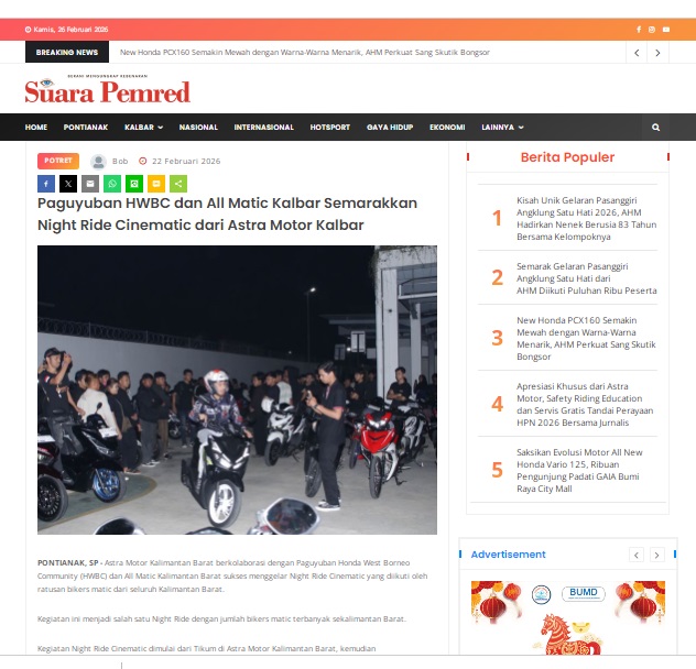 Paguyuban HWBC dan All Matic Kalbar Semarakkan Night Ride Cinematic dari Astra Motor Kalbar by masmul 22 Februari 2026 in Silahkan kunjungi https://www.suarapemredkalbar.com/read/potret/22022026/paguyuban-hwbc-dan-all-matic-kalbar-semarakkan-night-ride-cinematicdari-astra-motor-kalbar. You Might Like Regional Public Launching New ADV160 The SUV Pride Grand Launching New PCX 160 Truly Exceptional! Tetap hati-hati ya bro sist berkendara saat hujan.