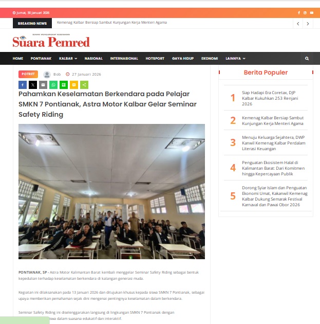 Pahamkan Keselamatan Berkendara pada Pelajar SMKN 7 Pontianak, Astra Motor Kalbar Gelar Seminar Safety Riding by masmul 26 Januari 2026 in Silahkan kunjungi https://www.suarapemredkalbar.com/read/potret/27012026/pahamkan-keselamatan-berkendara-pada-pelajar-smkn-7-pontianak-astra-motor-kalbar-gelar-seminar-safety-riding-1. You Might Like Regional Public Launching New ADV160 The SUV Pride Grand Launching New PCX 160 Truly Exceptional! Tetap hati-hati ya bro sist berkendara saat hujan.
