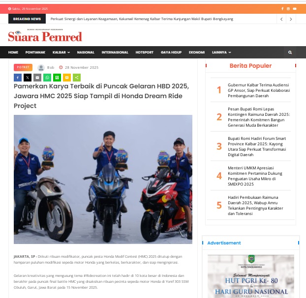 Pamerkan Karya Terbaik di Puncak Gelaran HBD 2025, Jawara HMC 2025 Siap Tampil di Honda Dream Ride Project by masmul 28 November 2025 in Silahkan kunjungi https://www.suarapemredkalbar.com/read/potret/28112025/pamerkan-karya-terbaik-di-puncak-gelaran-hbd-2025-jawara-hmc-2025-siap-tampil-di-honda-dream-ride-project. You Might Like Regional Public Launching New ADV160 The SUV Pride Grand Launching New PCX 160 Truly Exceptional! Tetap hati-hati ya bro sist berkendara saat hujan.