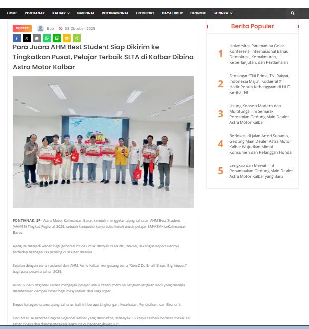 Para Juara AHM Best Student Siap Dikirim ke Tingkatkan Pusat, Pelajar Terbaik SLTA di Kalbar Dibina Astra Motor Kalbar by masmul 3 Oktober 2025 in Silahkan kunjungi https://www.suarapemredkalbar.com/read/potret/03102025/para-juara-ahm-best-student-siap-dikirim-ke-tingkatkan-pusat-pelajar-terbaik-slta-di-kalbar-dibina-astra-motor-kalbar. You Might Like Regional Public Launching New ADV160 The SUV Pride Grand Launching New PCX 160 Truly Exceptional! Tetap hati-hati ya bro sist berkendara saat hujan.