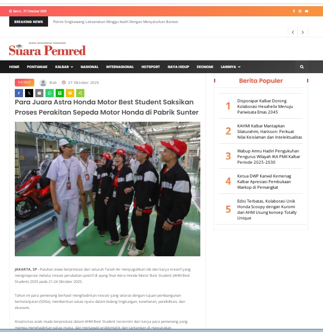 Para Juara Astra Honda Motor Best Student Saksikan Proses Perakitan Sepeda Motor Honda di Pabrik Sunter by masmul 27 Oktober 2025 in Silahkan kunjungi https://www.suarapemredkalbar.com/read/potret/27102025/para-juara-astra-honda-motor-best-student-saksikan-proses-perakitan-sepeda-motor-honda-di-pabrik-sunter. You Might Like Regional Public Launching New ADV160 The SUV Pride Grand Launching New PCX 160 Truly Exceptional! Tetap hati-hati ya bro sist berkendara saat hujan.