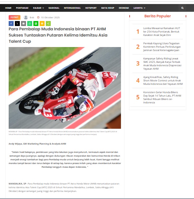 Para Pembalap Muda Indonesia binaan PT AHM Sukses Tuntaskan Putaran Kelima Idemitsu Asia Talent Cup by masmul 10 Oktober 2025 in Silahkan kunjungi https://www.suarapemredkalbar.com/read/potret/10102025/para-pembalap-muda-indonesia-binaan-pt-ahm-sukses-tuntaskan-putaran-kelima-idemitsu-asia-talent-cup. You Might Like Regional Public Launching New ADV160 The SUV Pride Grand Launching New PCX 160 Truly Exceptional! Tetap hati-hati ya bro sist berkendara saat hujan.