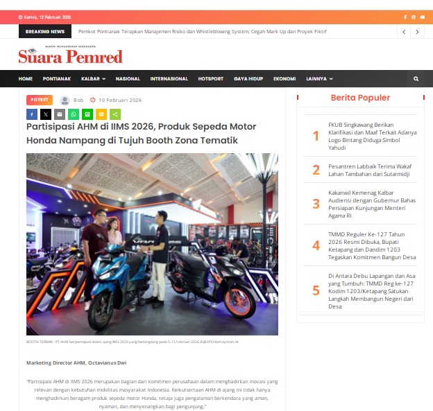 Partisipasi AHM di IIMS 2026, Produk Sepeda Motor Honda Nampang di Tujuh Booth Zona Tematik by masmul 10 Februari 2026 in Silahkan kunjungi https://www.suarapemredkalbar.com/read/potret/10022026/partisipasi-ahm-di-iims-2026-produk-sepeda-motor-honda-nampang-di-tujuh-booth-zona-tematik. You Might Like Regional Public Launching New ADV160 The SUV Pride Grand Launching New PCX 160 Truly Exceptional! Tetap hati-hati ya bro sist berkendara saat hujan.