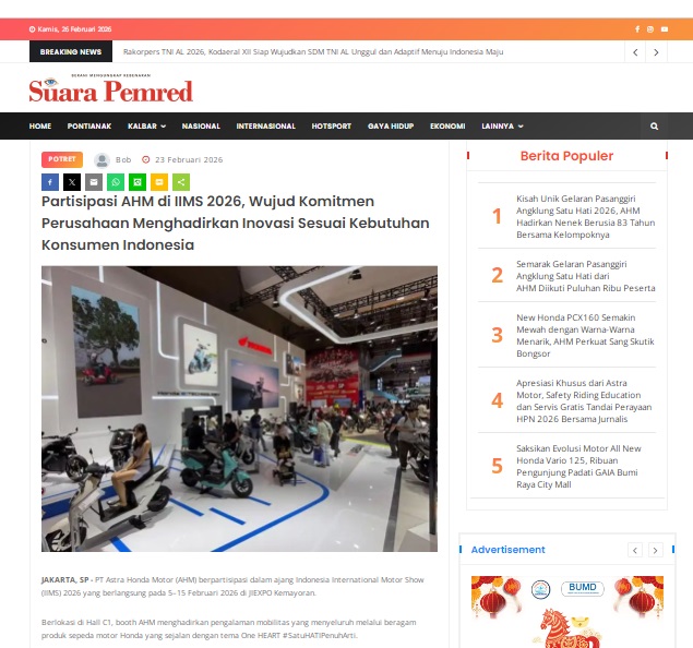 Partisipasi AHM di IIMS 2026, Wujud Komitmen Perusahaan Menghadirkan Inovasi Sesuai Kebutuhan Konsumen Indonesia by masmul 23 Februari 2026 in Silahkan kunjungi https://www.suarapemredkalbar.com/read/potret/23022026/partisipasi-ahm-di-iims-2026-wujud-komitmen-perusahaan-menghadirkan-inovasi-sesuai-kebutuhan-konsumen-indonesia. You Might Like Regional Public Launching New ADV160 The SUV Pride Grand Launching New PCX 160 Truly Exceptional! Tetap hati-hati ya bro sist berkendara saat hujan.