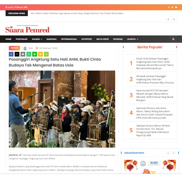 Pasanggiri Angklung Satu Hati AHM, Bukti Cinta Budaya Tak Mengenal Batas Usia by masmul 24 Februari 2026 in Silahkan kunjungi https://www.suarapemredkalbar.com/read/potret/24022026/pasanggiri-angklung-satu-hati-ahm-bukti-cinta-budaya-tak-mengenal-batas-usia. You Might Like Regional Public Launching New ADV160 The SUV Pride Grand Launching New PCX 160 Truly Exceptional! Tetap hati-hati ya bro sist berkendara saat hujan.