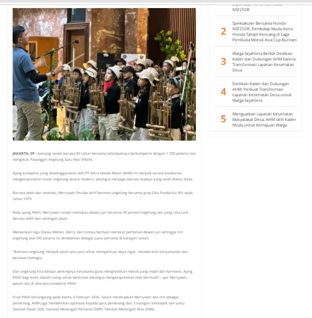 Pasanggiri Angklung Satu Hati dari AHM Dimeriahkan Nenek Merrywati Peruba yang Berusia 83 Tahun by masmul 2 Maret 2026 in Silahkan kunjungi https://www.suarapemredkalbar.com/read/potret/02032026/pasanggiri-angklung-satu-hati-dari-ahmdimeriahkan-nenek-merrywati-peruba-yang-berusia-83-tahun. You Might Like Regional Public Launching New ADV160 The SUV Pride Grand Launching New PCX 160 Truly Exceptional! Tetap hati-hati ya bro sist berkendara saat hujan.