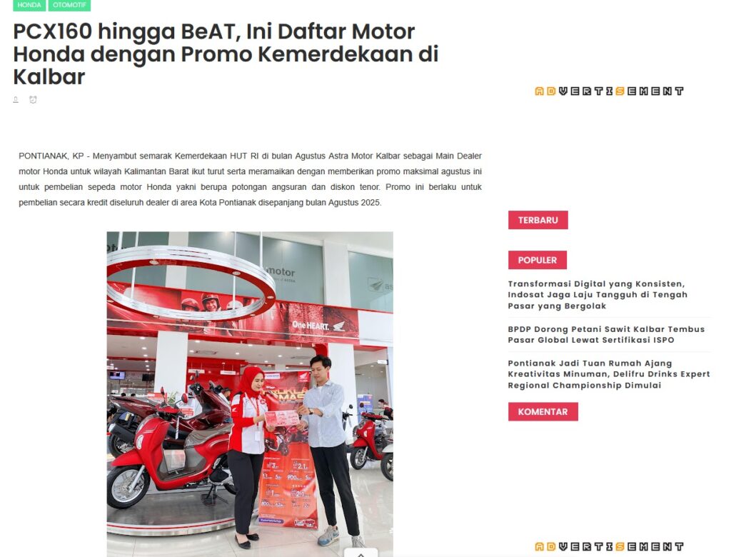 PCX160 hingga BeAT, Ini Daftar Motor Honda dengan Promo Kemerdekaan di Kalbar by Muhammad Arif 23 Agustus 2025 in Silahkan kunjungi https://www.kapuaspost.web.id/2025/08/pcx160-hingga-beat-ini-daftar-motor.html. Tags: astra Astra Motor kalbar Astra Motor Pontianak astramotor honda kalbar pontianak sepeda motor You Might Like Regional Public Launching New ADV160 The SUV Pride Grand Launching New PCX 160 Truly Exceptional! Tetap hati-hati ya bro sist berkendara saat hujan.