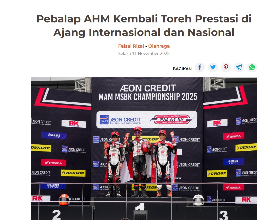 Pebalap AHM Kembali Toreh Prestasi di Ajang Internasional dan Nasional by Dodi Dodi 11 November 2025 in Silahkan kunjungi https://harianberkat.com/2025/11/11/pebalap-ahm-kembali-toreh-prestasi-di-ajang-internasional-dan-nasional/. You Might Like Regional Public Launching New ADV160 The SUV Pride Grand Launching New PCX 160 Truly Exceptional! Tetap hati-hati ya bro sist berkendara saat hujan.