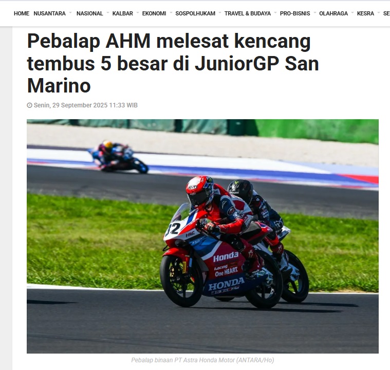 Pebalap AHM melesat kencang tembus 5 besar di JuniorGP San Marino by Dedi 29 September 2025 in Silahkan kunjungi https://kalbar.antaranews.com/berita/667529/pebalap-ahm-melesat-kencang-tembus-5-besar-di-juniorgp-san-marino. You Might Like Regional Public Launching New ADV160 The SUV Pride Grand Launching New PCX 160 Truly Exceptional! Tetap hati-hati ya bro sist berkendara saat hujan.