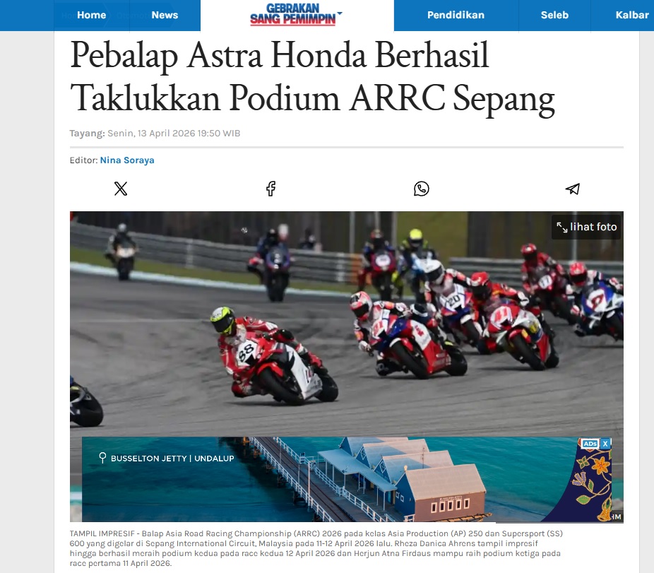 Pebalap Astra Honda Berhasil Taklukkan Podium ARRC Sepang by Nina Soraya 13 April 2026 in Silahkan kunjungi https://pontianak.tribunnews.com/otomotif/1168740/pebalap-astra-honda-berhasil-taklukkan-podium-arrc-sepang. You Might Like Regional Public Launching New ADV160 The SUV Pride Grand Launching New PCX 160 Truly Exceptional! Tetap hati-hati ya bro sist berkendara saat hujan.