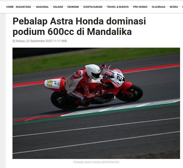 Pebalap Astra Honda dominasi podium 600cc di Mandalika by Dedi 29 September 2025 in Silahkan kunjungi https://kalbar.antaranews.com/berita/666828/pebalap-astra-honda-dominasi-podium-600cc-di-mandalika. You Might Like Regional Public Launching New ADV160 The SUV Pride Grand Launching New PCX 160 Truly Exceptional! Tetap hati-hati ya bro sist berkendara saat hujan.